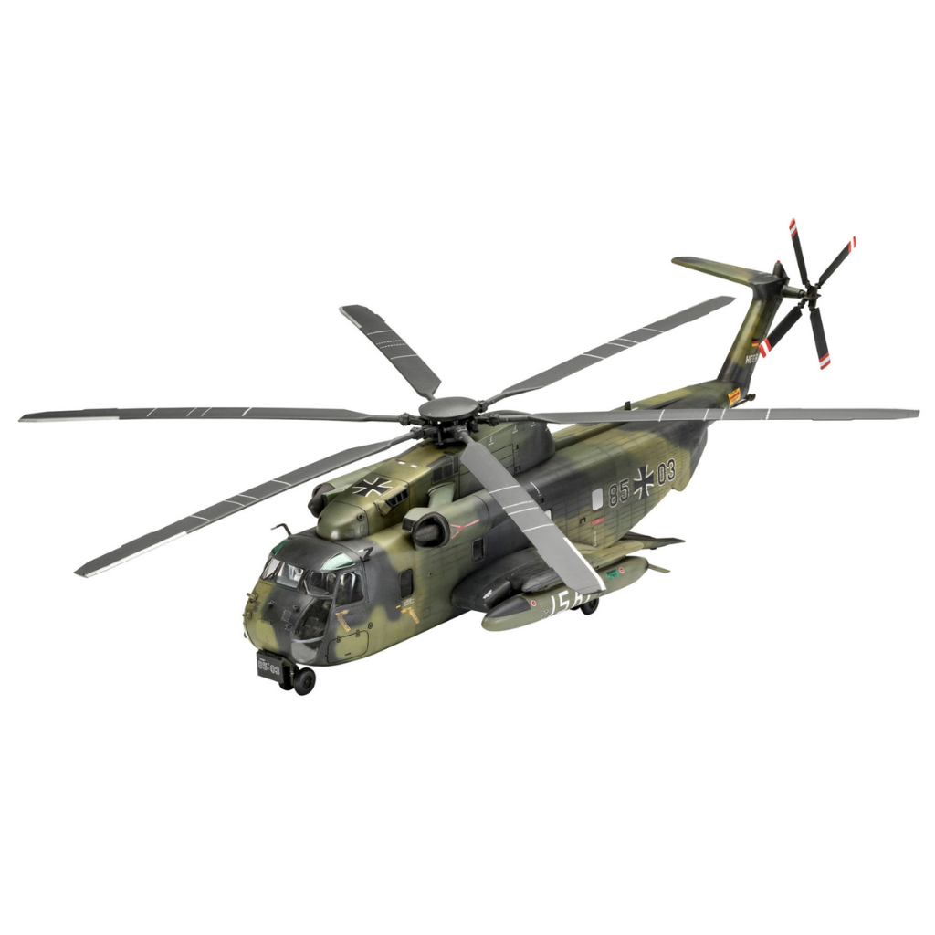 Model kit of the highly efficient heavy-lift transport helicopter of the German army, the CH-53 in the GSG version with improved combat efficiency. These helicopters were named CH-53 GSG and, among other things, featured an electronic warfare system for defence against anti-aircraft missiles, as well as a range increase in connection with ground-independent navigation and the capacity to fly at low altitudes at night. ? Sensor and camera parts for the fuselage ? Pylon support and new, additional tanks ? Antennas under the fuselage ? Detailed cockpit ? Movable loading ramp at the rear ? Movable main and tail rotors Authentic representation of the following versions: - Sikorsky CH-53 GS, HFR 32 Rheine, May 2002 - Sikorsky CH-53 G, HFR 35, Mendig/Germany, April 2002